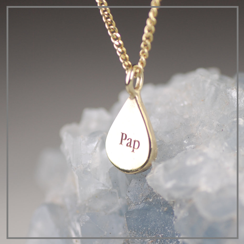 Een fijn druppeltje van een centimeter met een kleur naar keuze. Een goed formaat om iedere dag te dragen. Op de achterzijde komt een gravure te staan.