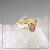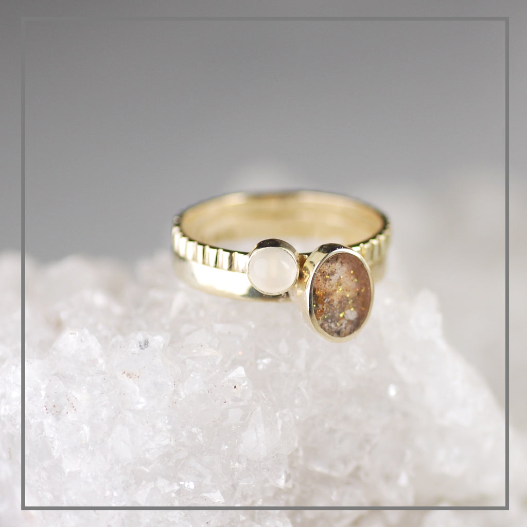 Een mooie combinatie van rond en ovaal. Een maansteen en een ascomponent met bladgoud.