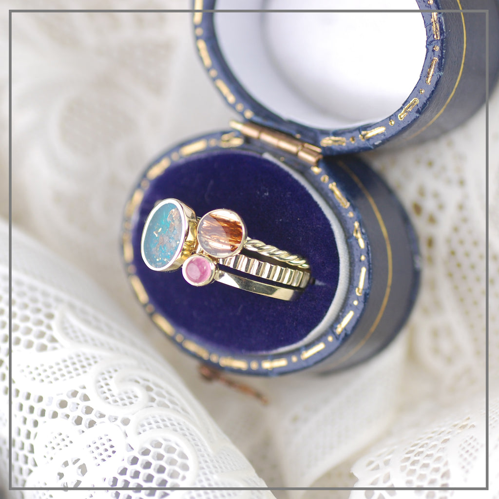 Drie ringen, een getordeerde haarlokring, een asring met een ovaal en ribbeltjes en een zoet ringetje met een roze Toermalijn. Een ode aan een leven.