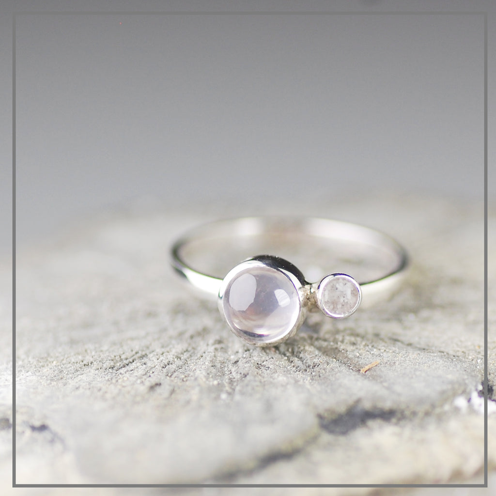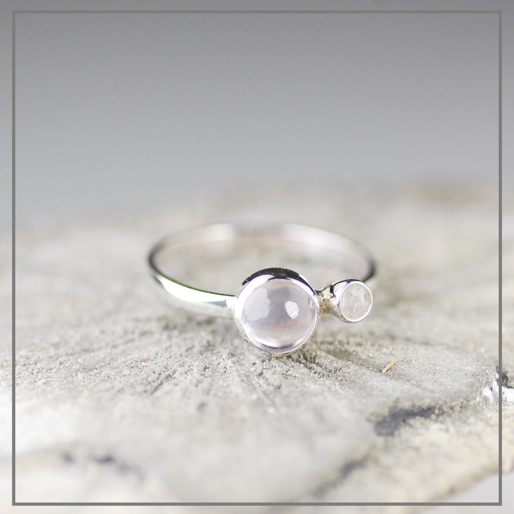 Een assymetrische ring met een 6 mm grote, lichte Rozekwarts en een as-componentje van 4 mm.Organisch, rustig en zacht van vorm.