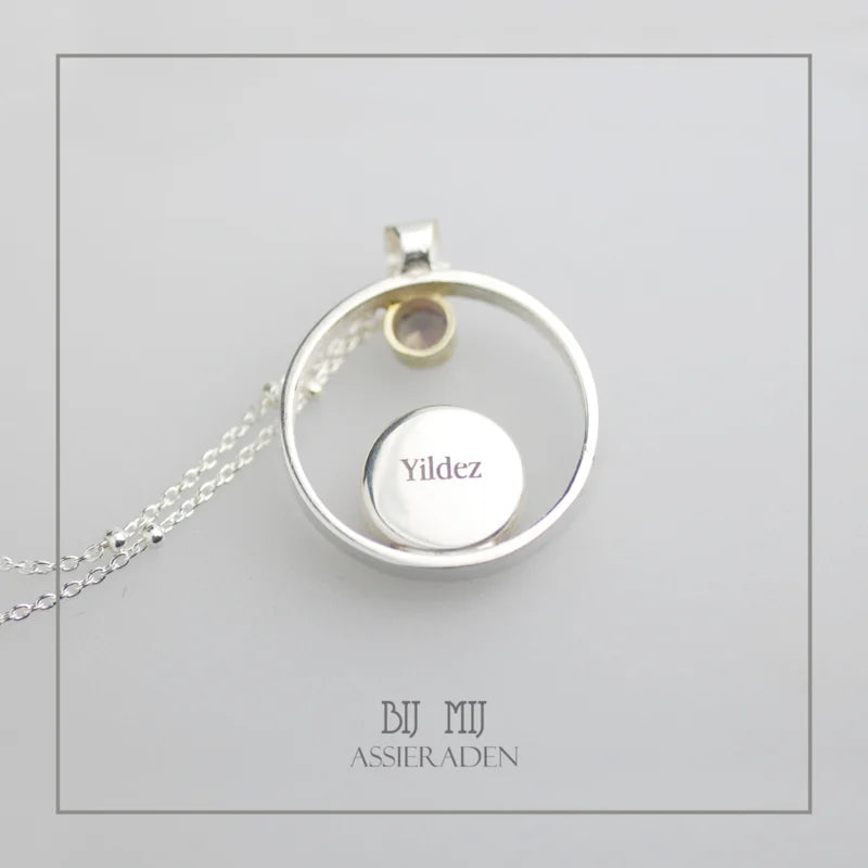 Een bijzondere hanger van twee centimeter groot met een haarlokje, 24 karaat bladgoud en een geboortesteen naar keuze.