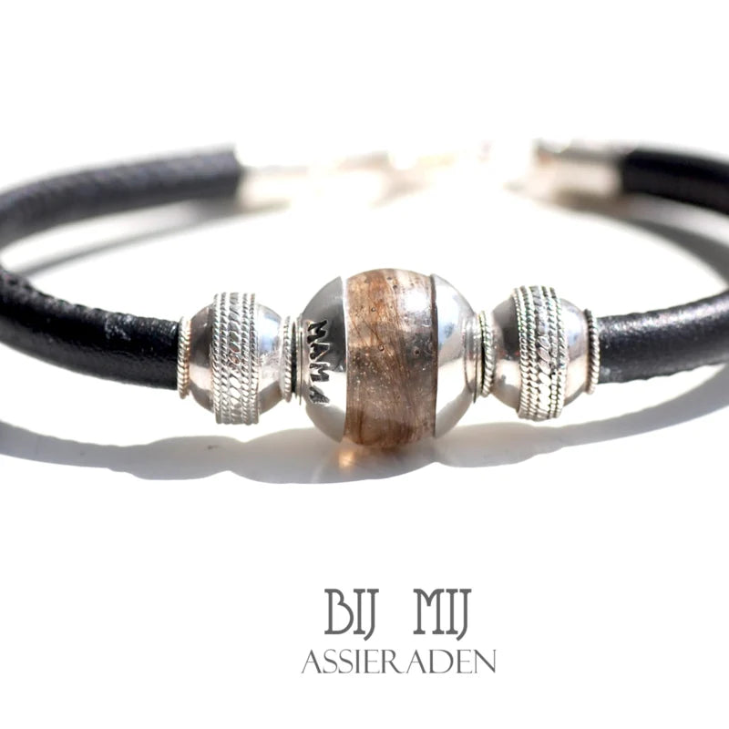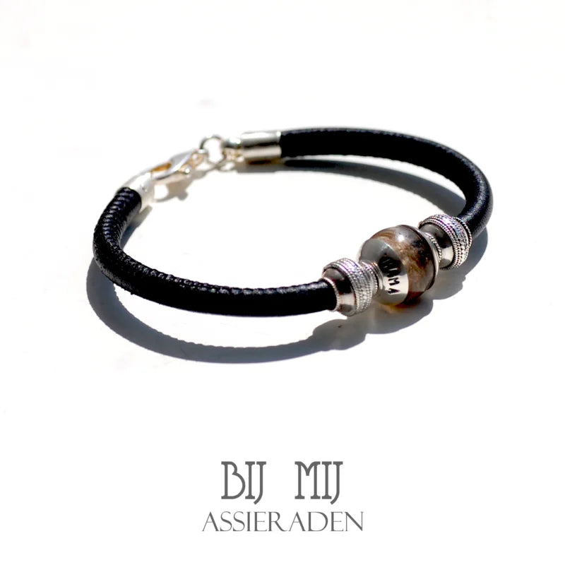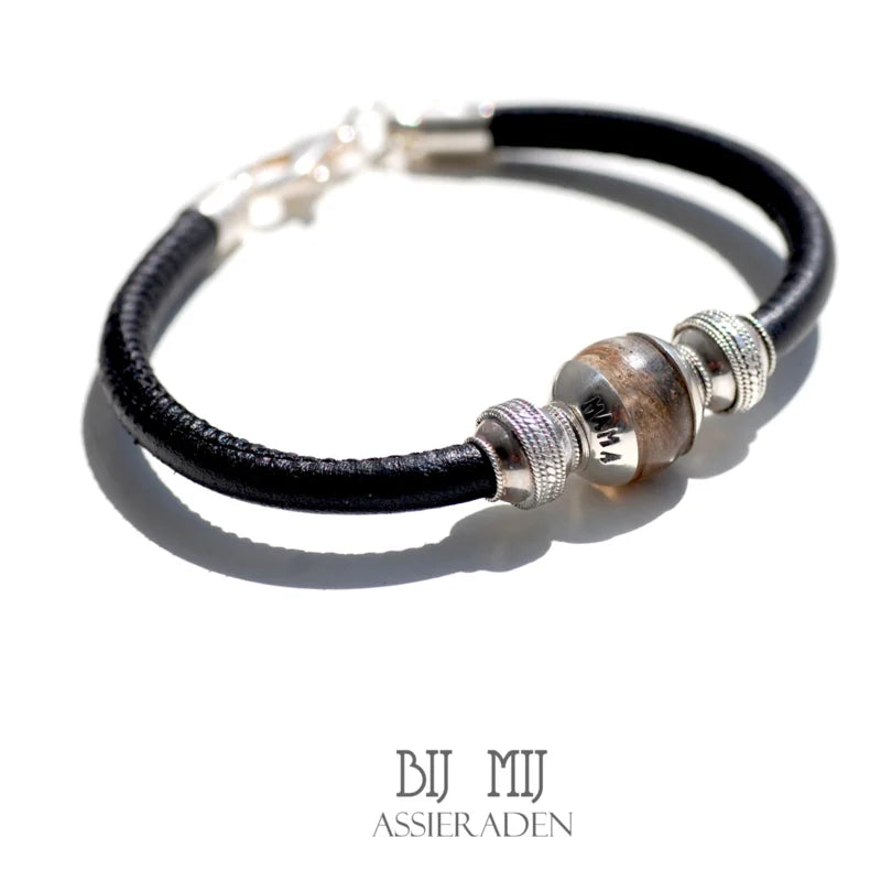 Een stoere, lederen band met Mudra kralen en een transparante haarlok-kraal. Op de zilveren eindstukken van de kraal zetten we een naam en datum. Ik maak de armband op maat zodat hij perfect aansluit aan je pols.