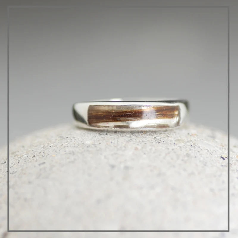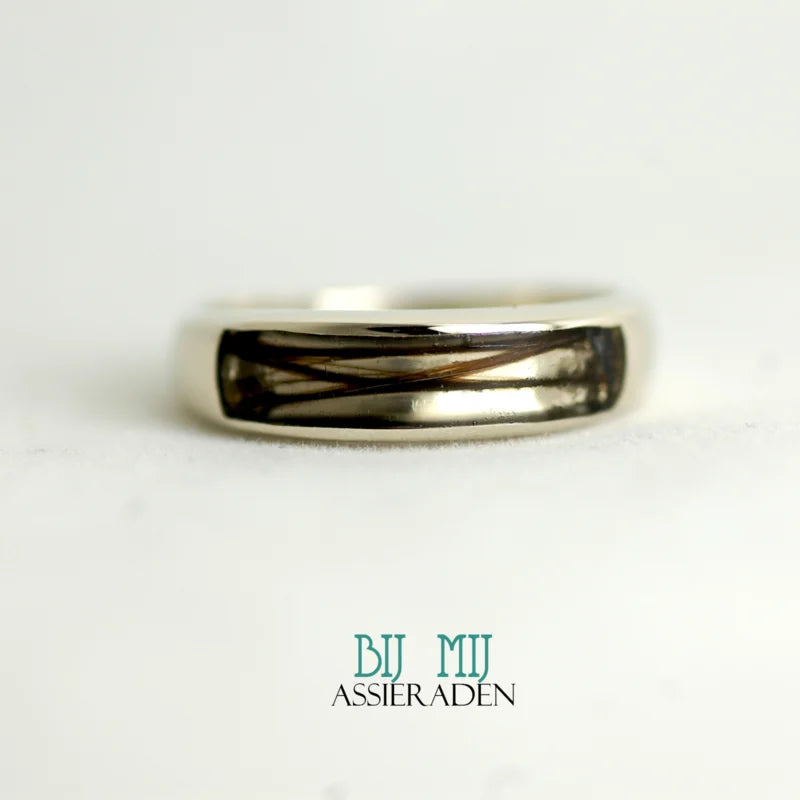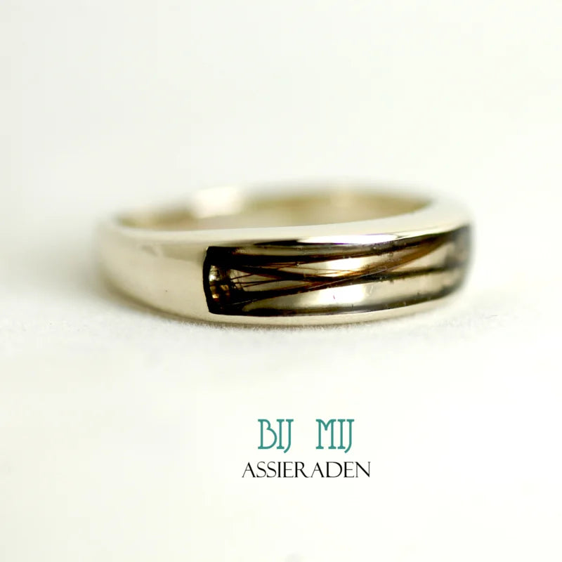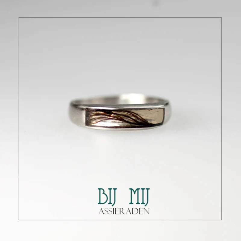 In deze zilveren ring zit een lok van degene die je zo graag bij je draagt. De ring is ook in geelgoud, witgoud of roodgoud te bestellen. Prijs op aanvraag.