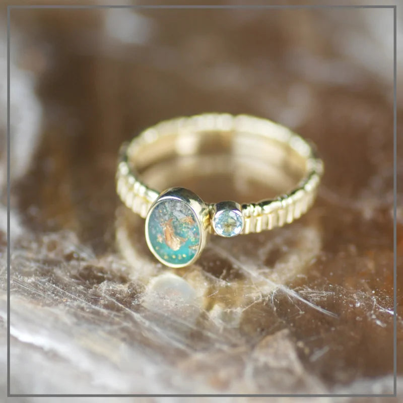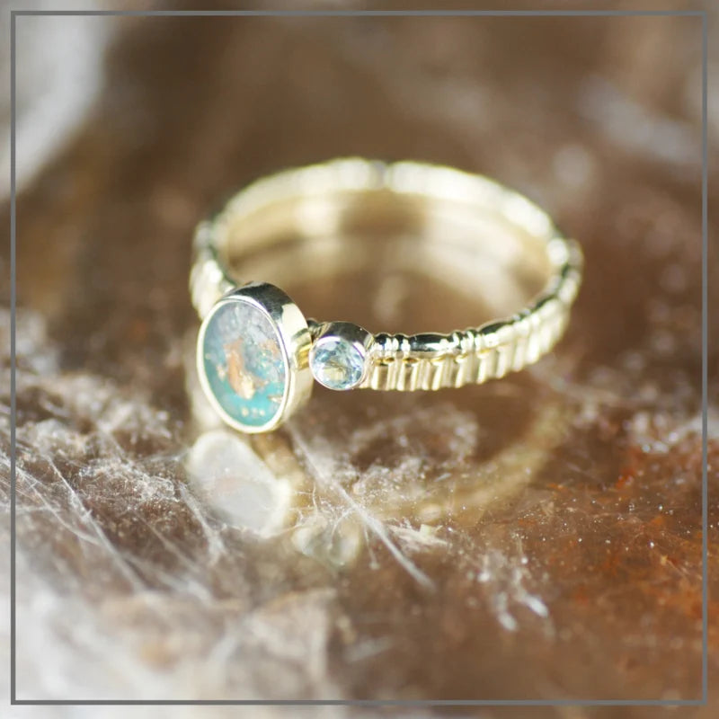 Een ovaal op een ribbeltjesring met een stoer karakter is gecombineert met een vintagering met prinses-zetting. De geboortesteen kies je zelf.